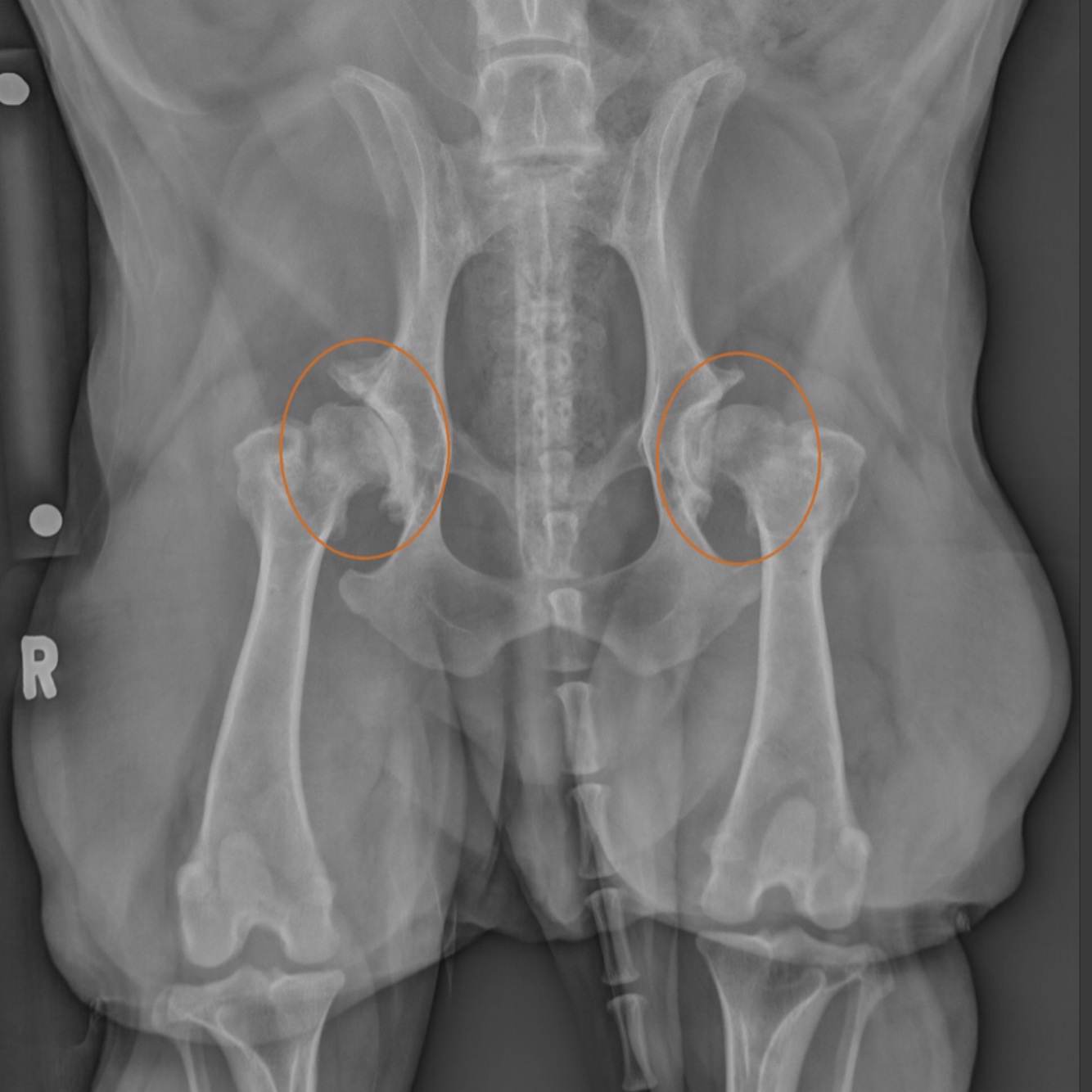 In order to definitively diagnose the condition you would want to proceed with a complete exam, basic bloodwork, and a CT or MRI of the lumbosacral region. Although this patient does exhibit evidence of hip dysplasia radiographically, the clinical signs are not characteristic of a dog with pain secondary to hip dysplasia. There is no indication of osteomyelitis on these radiographs and the clinical signs are not necessarily suggestive of osteomyelitis.