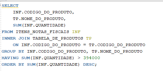 Redesenhe esta consulta, criando uma visão para a lista de quantidades totais por produto e aplicando a condição e ordenação sobre essa mesma visão.