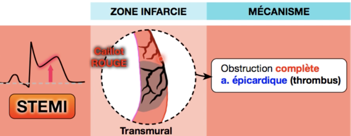 Quel est le mécanisme et la zone infarcie associés au STEMI?