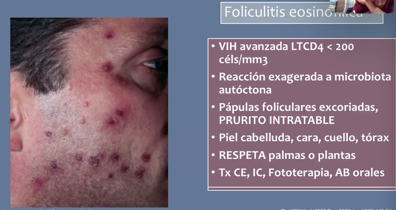 Foliculitis eosinofílica: CD4, FP, clínica, loc, respeta, tx