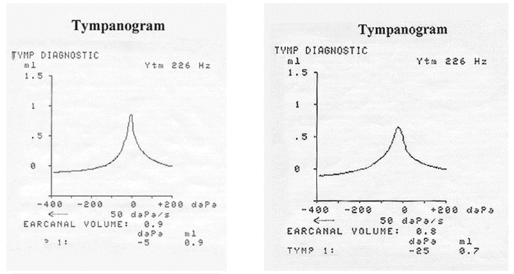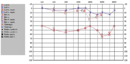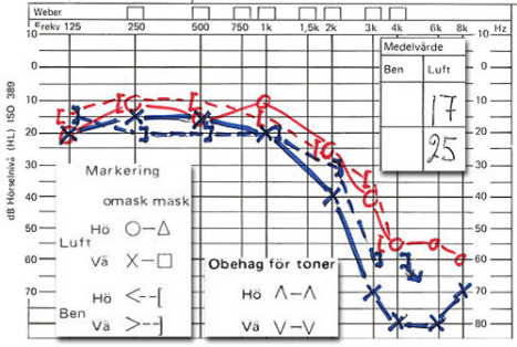 o Exempel på eventuell mellanöreskada höger om vaxpropp ej föreligger, streckad linje är helt okej. Luftburen går ej in, betyder att det finns ledningshinder: söndrig trumhinna, fastväxt stigbygel, söndriga ben