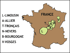 * **Limousin** * **Vosges** * **Nevers** * **Bertranges** * **Allier** * **Tronçais** (sub-section of Allier)