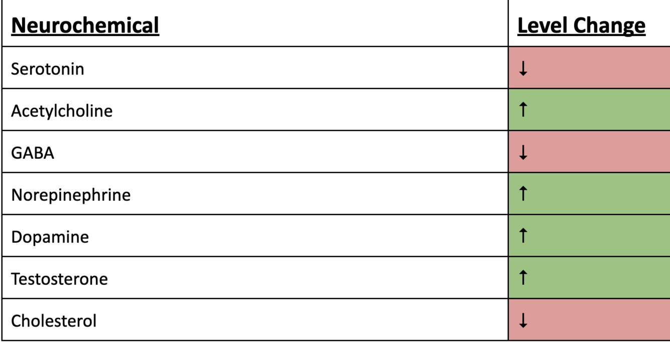 Increased levels of ________(4 neurochemicals) are associated with violence.