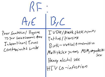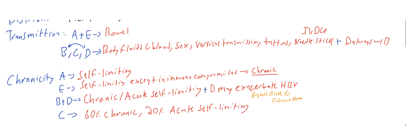 Describe the transmission and chronicity of the types of viral hepatitis.