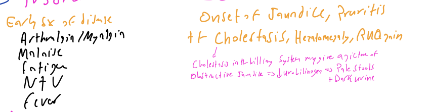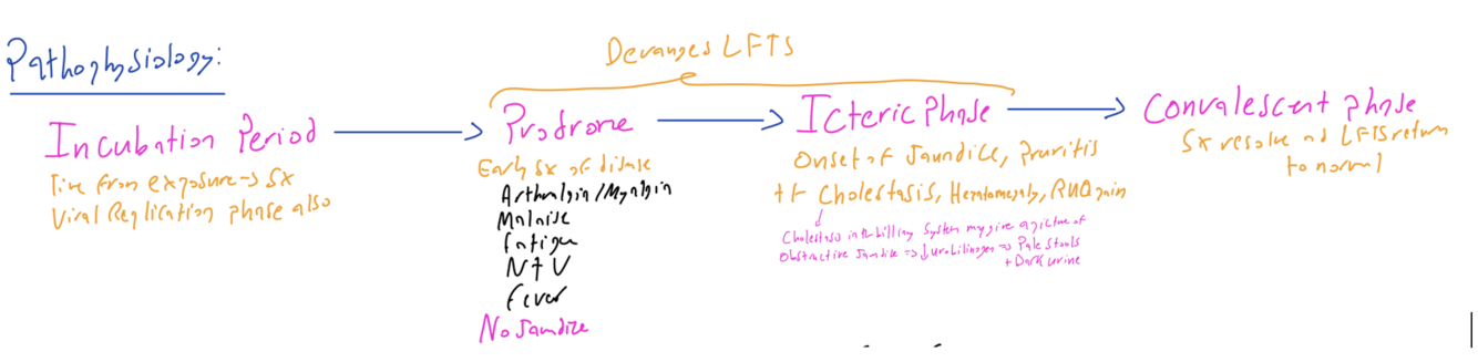 Describe the pathophysiology of viral hep. Include the symptom timeline.