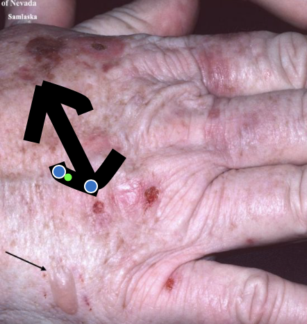 porphyria cutanea tarda - small erythematous erosion on the dorsum of the hand.