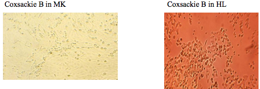 All six serotypes grow well in MK and HL cells but little if any growth is seen in HDF cells. The CPE is a small uniform rounding which rapidly progresses to total monolayer destruction.