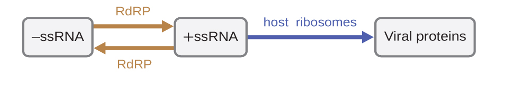 -ssRNA <–(rdRP)–> + ssRNA —(host ribosomes)–> viral proteins