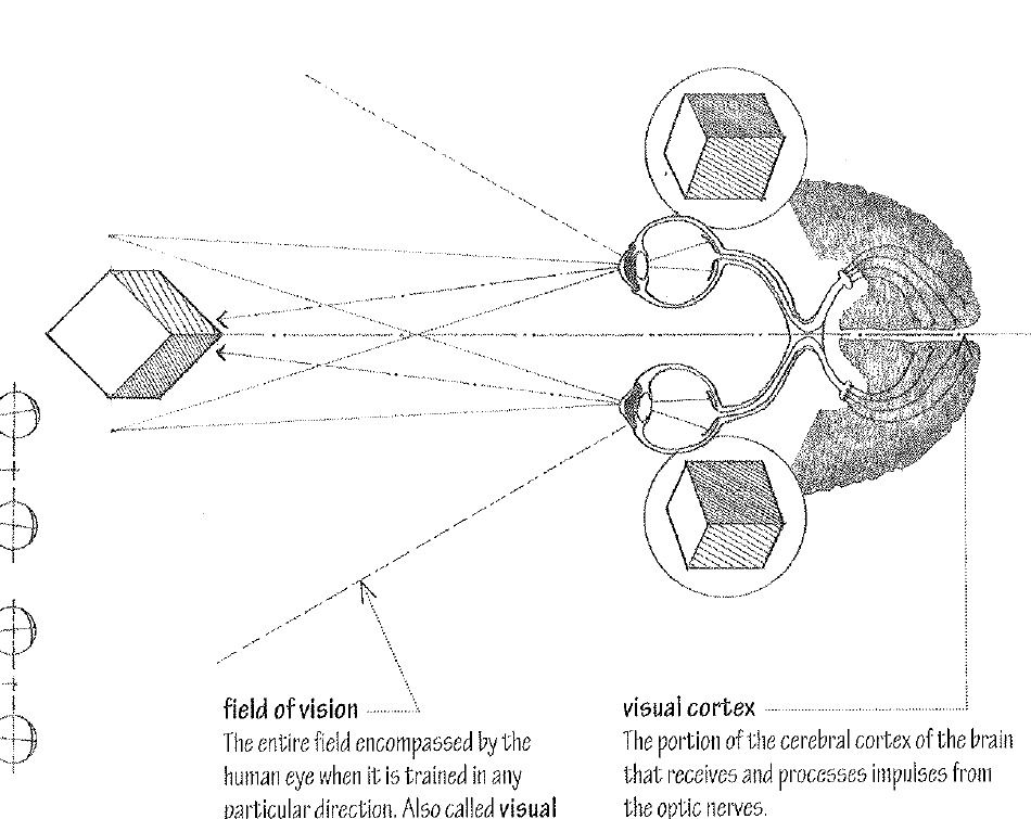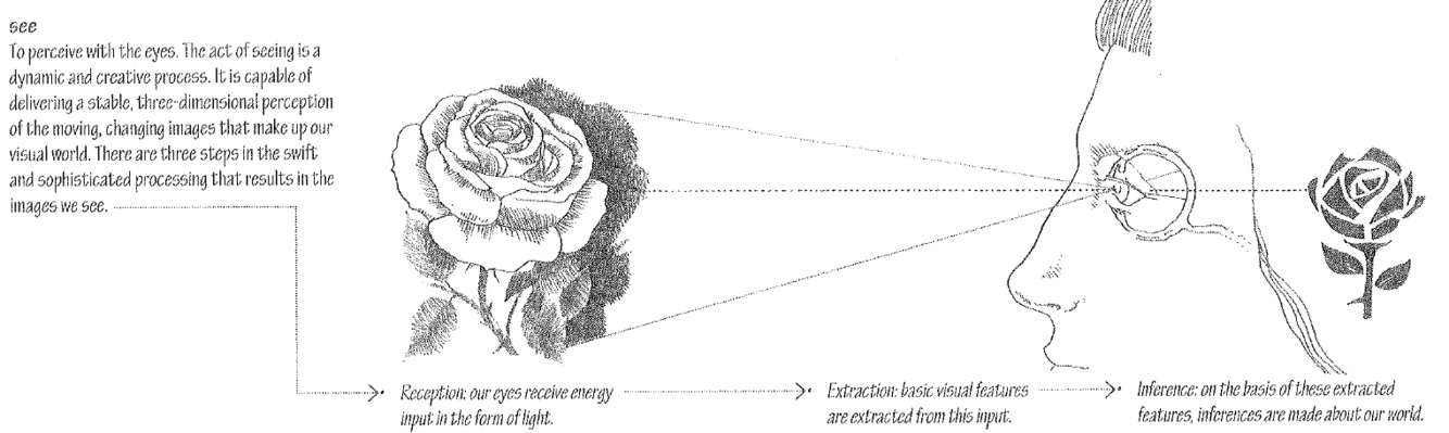 To perceive with the eyes. The act of seeing is a dynamic and creative process. It is capable of delivering a stable, three-dimensional perception of the moving, changing images that make up our visual world. There are three steps in the swift and sophiticated processing the results in the images we see.