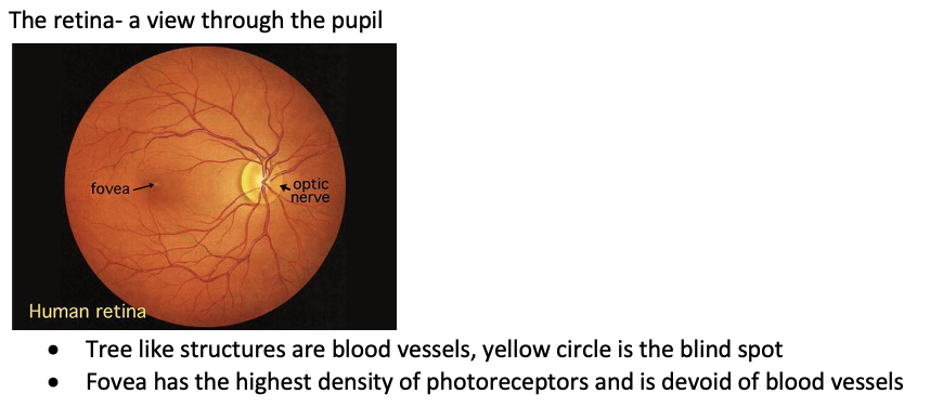 Blind spot is where retina ganglionic axons leave the eye to go towards the brain this is void of photoreceptors
