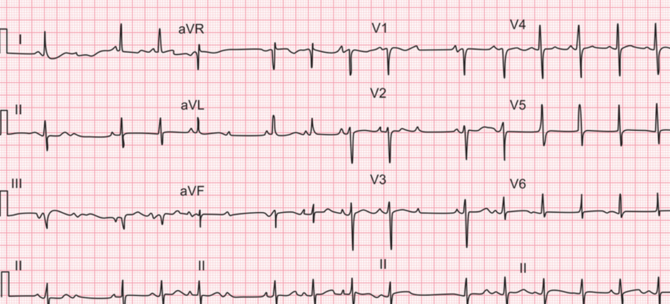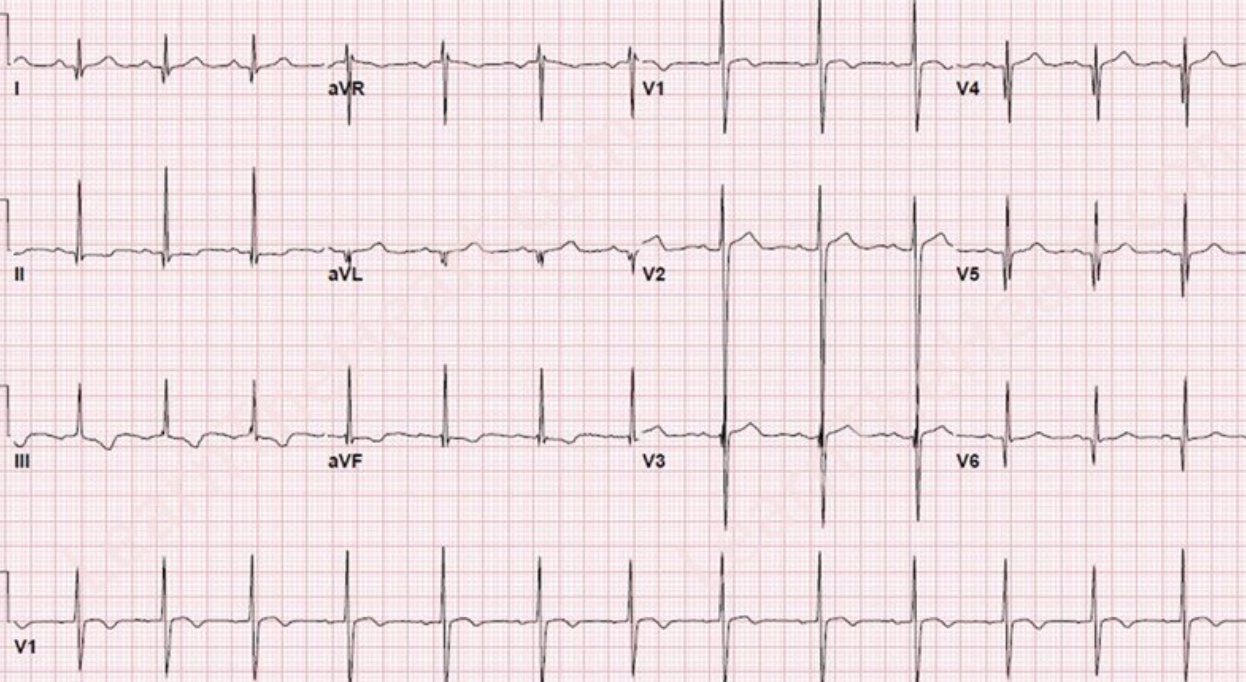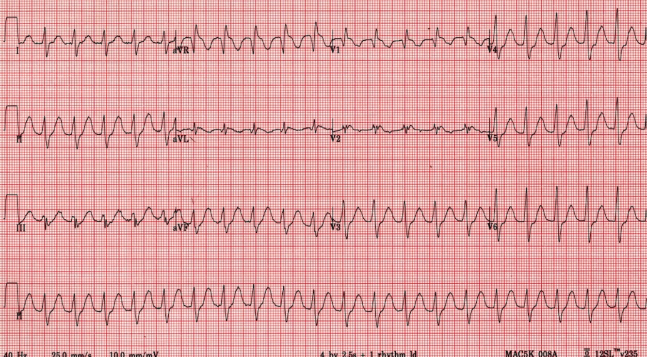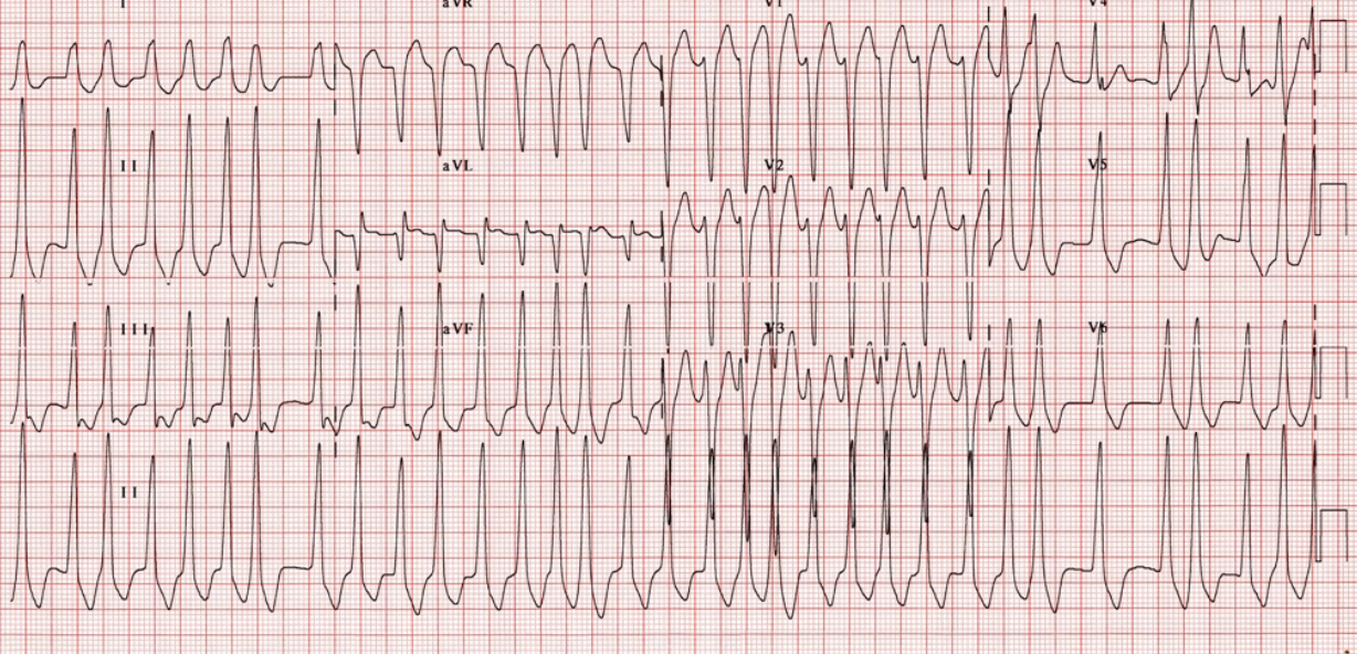 ECG showing regular broad complex tachycardia with widened QRS and abnormal terminal R wave in aVR.