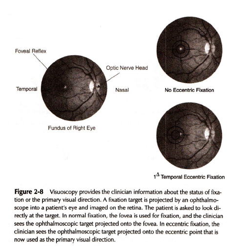 Ex. In low vision pt whose foveal vision is compromised by disease processes an extrafoveal point may be used (trained) for fixating eye to identify objects & reading. this is called eccentric viewing. The pt picks a retinal locus with better resolution than the diseased fovea to serve as a new fixation point.