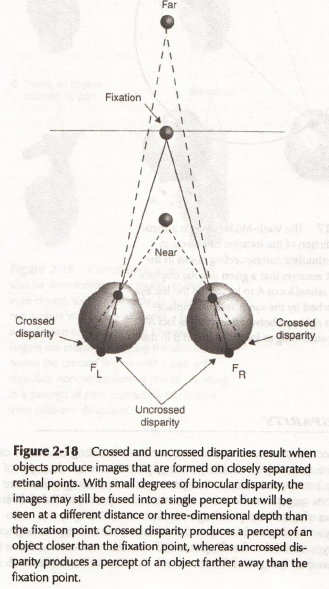 Images w/ crossed disparity are perceived nearer, wheras those with uncrossed disparity appear to be more distant than the fixation point (within VM circle)