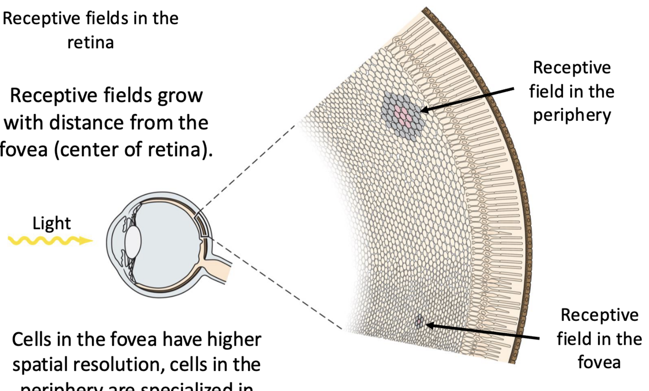 Cones: Human retina contains ~4.5 million cone cells. They are concentrated in the central portion of the retina (fovea), have high spatial resolution and specialize in colour vision.