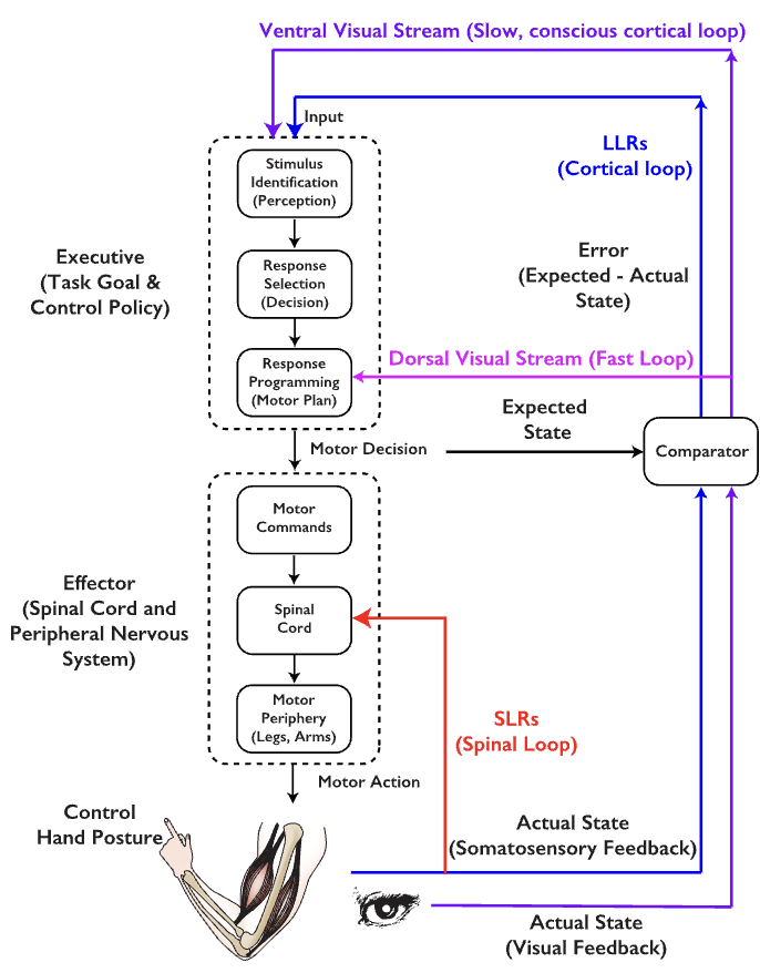 dorsal enters at response programming, fast loop, just helps change in movements, and tells us where we are in space