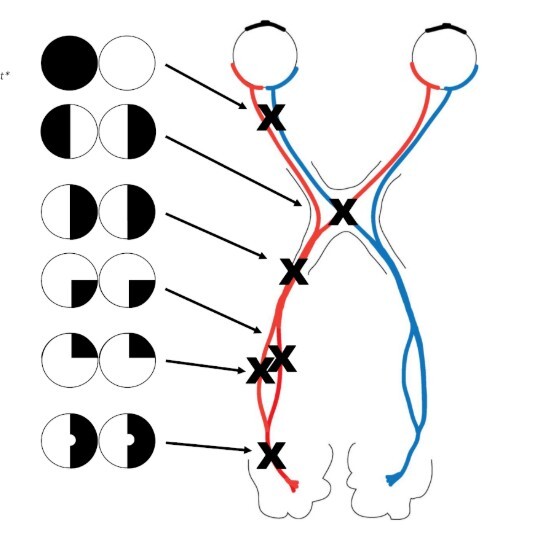 Lesion at the contralateral optic tract i.e. middle cerebral artery occlusion (stem), tumour in frontal/temporal lobe causing compression, large aneurysm - rare presentation (associated features i.e. ADPCKD, smoking, Ehler’s Danlos - doughy skin, scarring from previous skin tears, hypermobile joints, ask about previous dislocations)