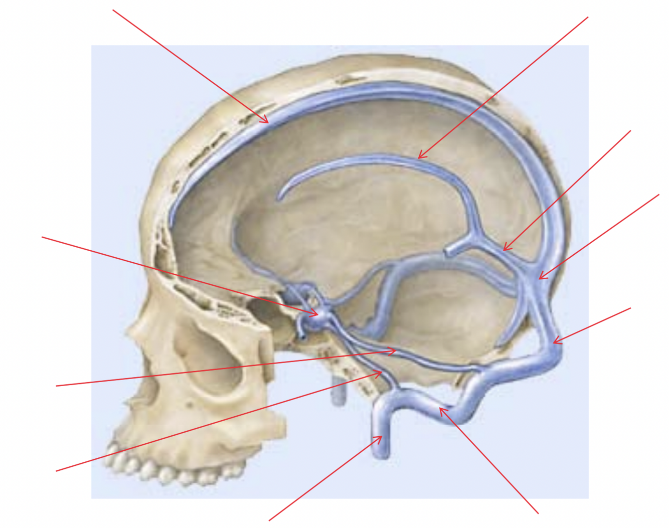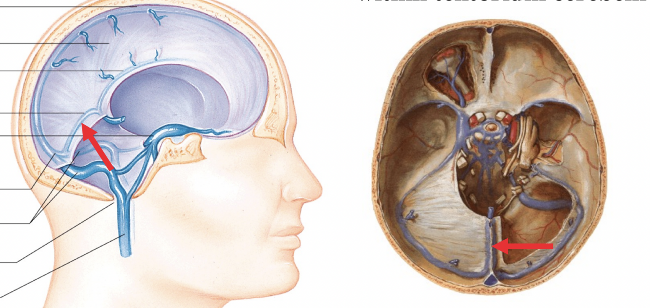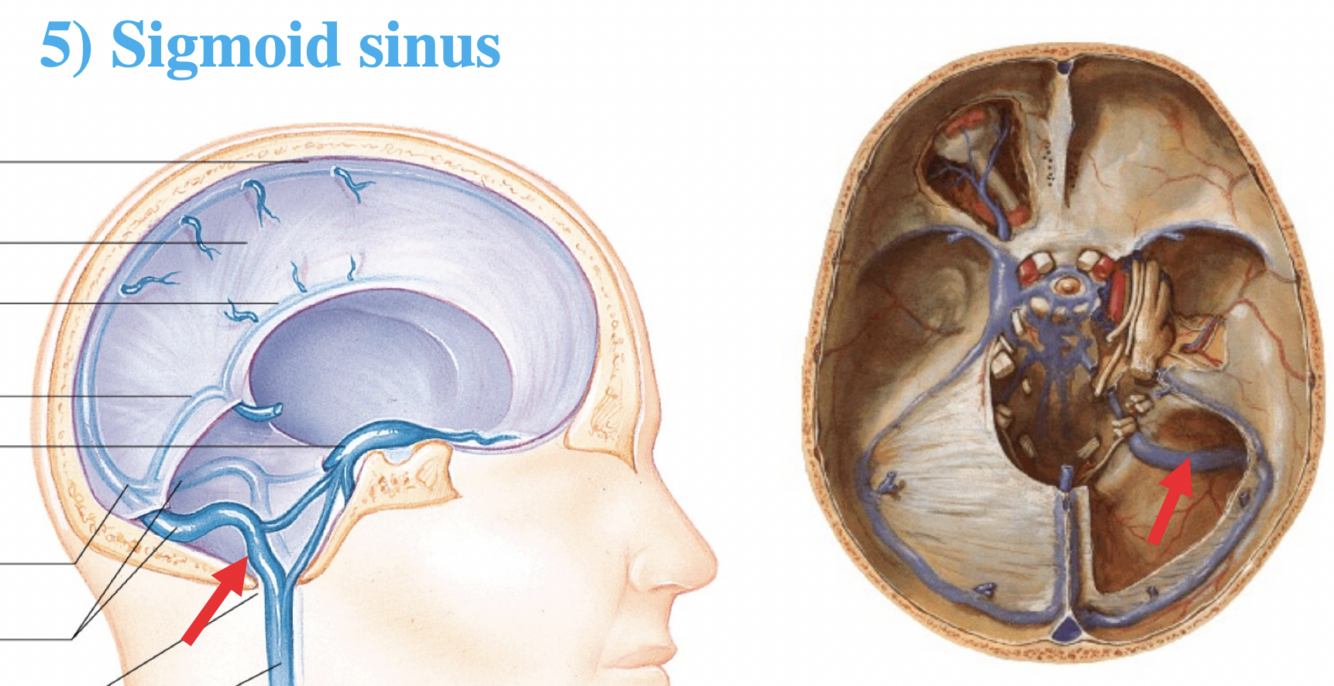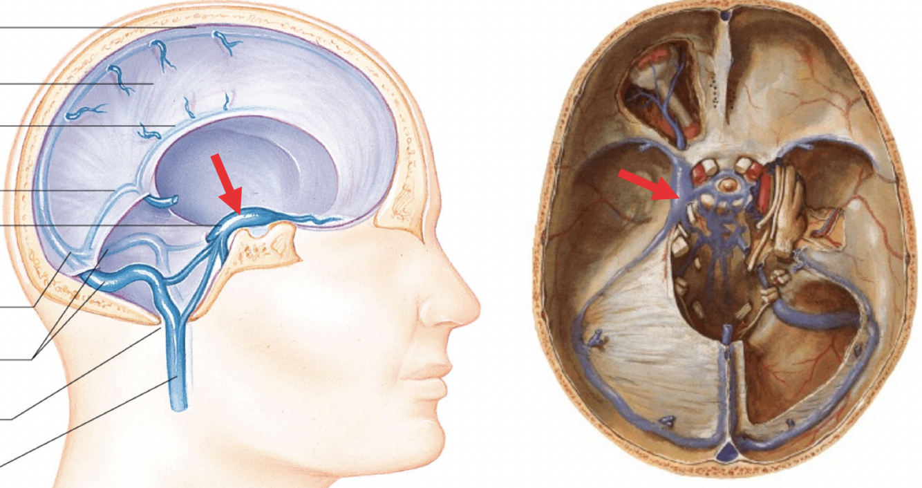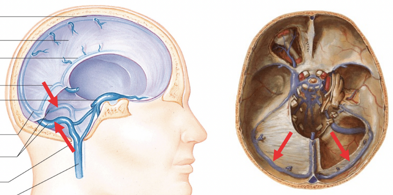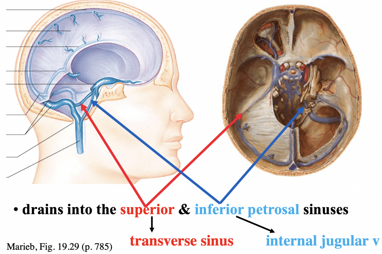Transverse sinus (superior petrosal) and internal jugular vein (inferior petrosal)
