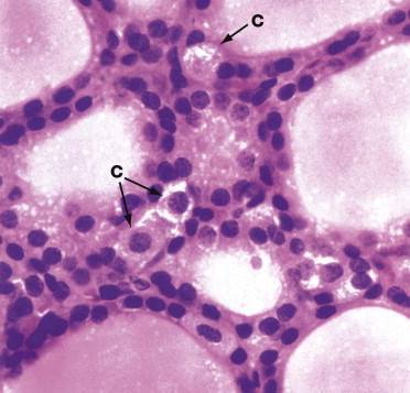 These are parafollicular cells. Recognize them by small pale staining clusters.