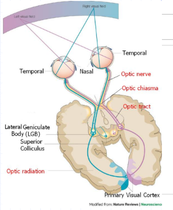 1) All fibres from the eye pass through the optic nerve to the optic chiasma
