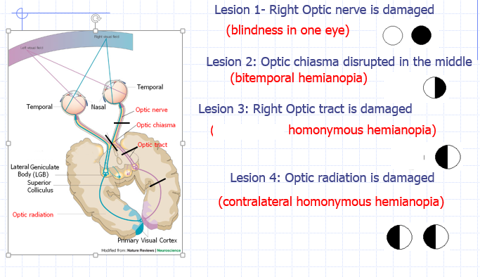 1) All fibres from the eye pass through the optic nerve to the optic chiasma