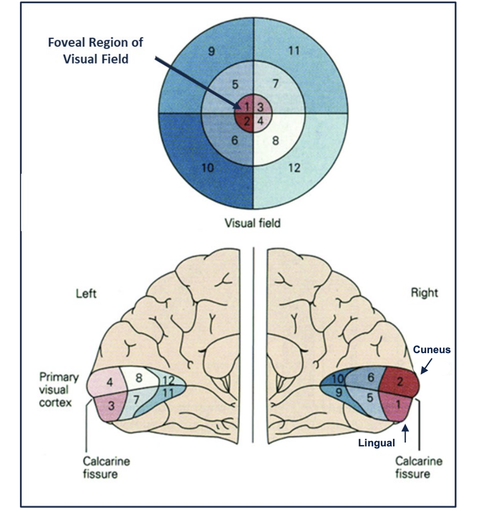 The upper visual field is processed in [occipital lobe region]