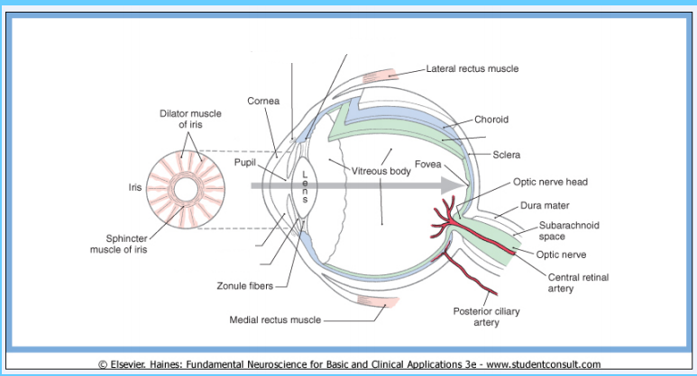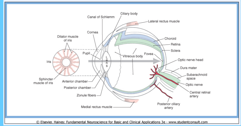 Light passing into the eye is transmitted to the retina through the cornea, anterior chamber lens and vitreous. The cornea is the most important refractive surface because of the transition from air to a tissue of much greater optical density. The lens makes fine adjustments in focus: accommodation for near objects results from contraction of the ciliary muscle under parasympathetic control, so that the natural elastic lens assumes a more convex shape as tension is relaxed on its suspensory ligaments (Zonules).