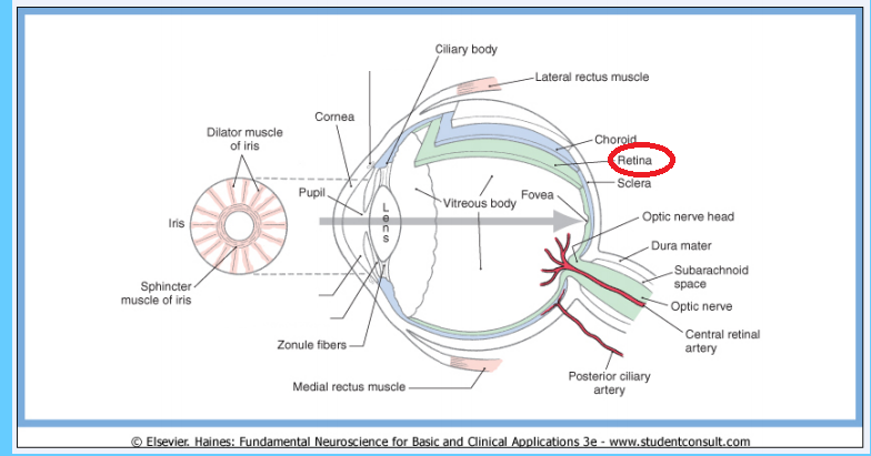 The retina contains the light sensitive photoreceptors (rods and cones), bipolar cells, ganglion cells, horizontal cells and amacrine cells organized in a highly laminated fashion to process visual information.