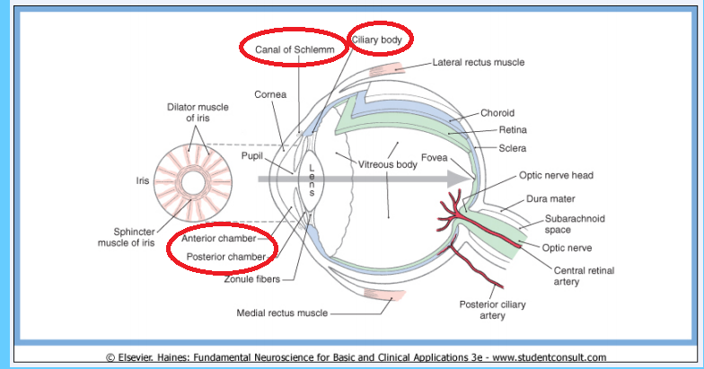 The anterior chamber is the fluid filled space between the cornea and the iris. The posterior chamber is the fluid filled space between the iris and the lens. Aqueous humor is produced in the posterior chamber by the epithelium of the ciliary body, flows over the lens and through the pupil into the anterior chamber. It then flows into the modified veins know as the canals of Schlemm at the outer rim of the anterior chamber at the angle where the iris meets the cornea. Posteriorly, the aqueous humor is in contact with the gelatinous vitreous humor.