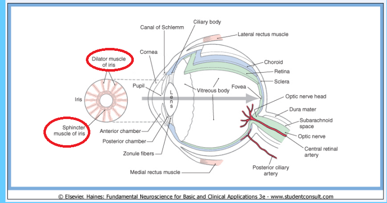 The iris dilator muscle consists of radial smooth muscle fibers that are on the outer portion of the iris. They are under sympathetic, adrenergic control.