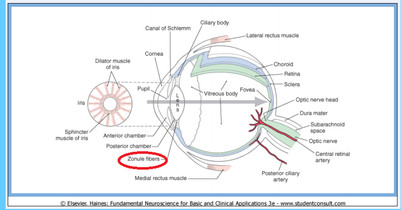THE CILIARY BODY in addition to its involvement in aqueous humor production also contains the ciliary muscle component. When this contracts during accommodation, it relaxes the tension on zonular ligaments that suspend the lens. The lens is elastic and assumes a more convex shape – increasing its optical power.