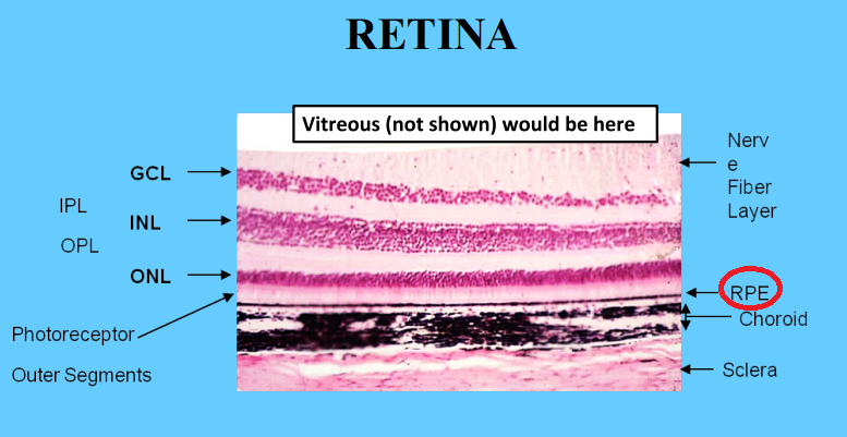 THE RETINAL PIGMENT EPITHELIUM (RPE) has important functions relative to photoreceptor and retinal maintenance. Its specialized basement membrane is Bruch’s membrane.