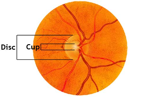 Optic cup: the disc has an orange-pink rim with a pale centre. This pale centre is devoid of neuroretinal tissue and is called the cup.