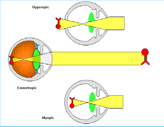 Normal eyes are emmetropic in that the optical system focuses parallel rays at the plane of the retina. In myopic (near sighted) eyes the rays come to focus in front of the retina; in hyperopic (farsighted) eyes they come to focus behind the retina.