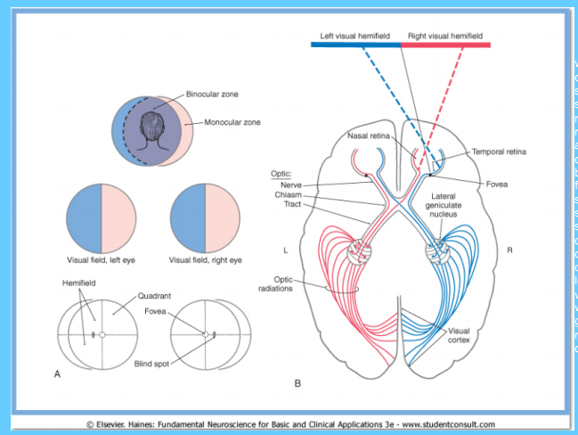 Retina, Optic Nerves, Chiasm, and Tracts. The lens reverses the retinal image so that the right visual field is seen by the nasal hemi (half) -retina of the right eye and the temporal hemiretina of the left eye. Optic nerve fibers from the nasal retina of the right eye decussate in the optic chiasm to join uncrossed fibers from the temporal retina of the left eye. Ganglion cell axons from the two eyes are mixed at the chiasm and sorted so that fibers representing the same areas of visual space from both eyes run in close proximity in the tracts. This essentially produces a double retinotopic representation in the pathway which is maintained throughout the geniculate and the cortical projection. The left tract, therefore, carries the information about the right visual field- each point in visual space doubly represented by optic axons from the right nasal retina and the left temporal retina.