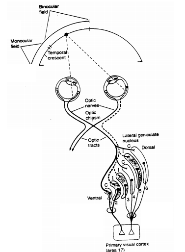 Axons from the two eyes remain segregated to synapse in alternate but retinotopically aligned layers of the lateral geniculate body. Crossed fibers from the contralateral nasal retina synapse in layers 1, 4, & 6 of the geniculate; uncrossed fibers from the ipsilateral temporal retina synapse in layers 2,3, & 5.