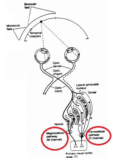 Axons synapsing with cells in layers 1 and 2 of the geniculate are from large (M-type) ganglion cells of the retina. These constitute the afferent component of the magnocellular subsystem in which convergent wide-field representations of the M cells are particularly good at sensing motion. The smaller ganglion cells (P-type) synapse in layers 3-6 to form a parvocellular subsystem that processes form and color attributes.