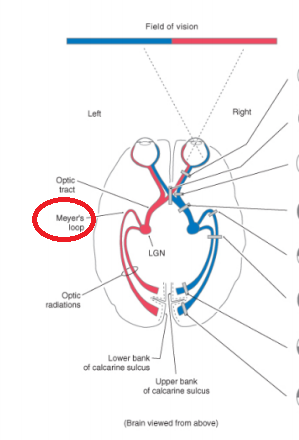 Note: the retinal image is also inverted so that the upper visual field seen by the inferior retina remains represented inferiorly along the visual pathway (conversely with the lower visual field). The inferior fibers (upper field) of the optic radiations form Meyer’s loop around the temporal horn of the lateral ventricle where they are widely separated from superior fibers (lower field) that have a more direct course to the occipital lobe.