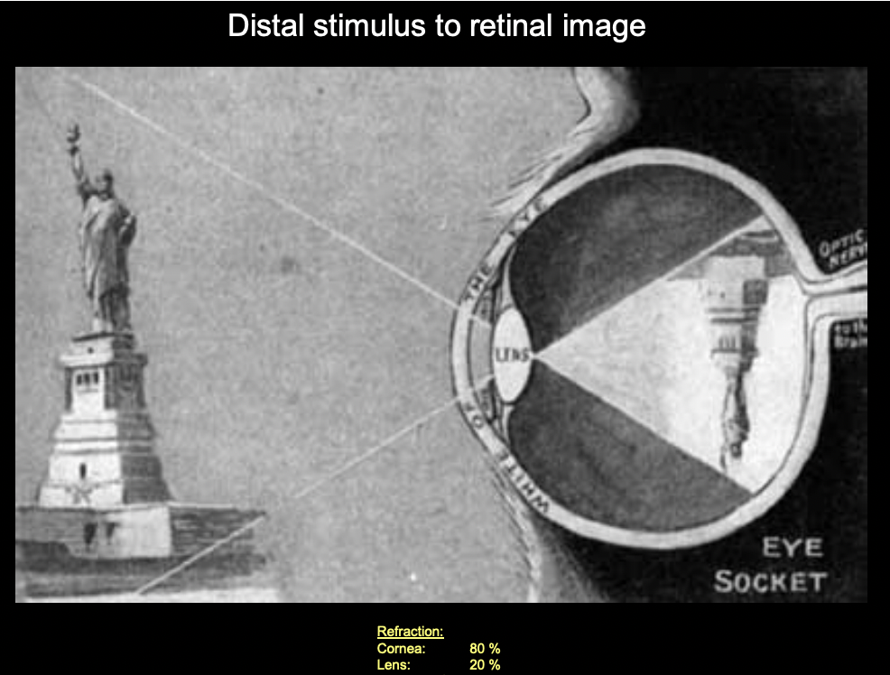 The light is refracted 80% by the cornea and 20% by the lens. This creates an inverted image in the back of the retina. The inversion is reversed later in the visual processing, the important thing is that the proportions of the image is not distorted.