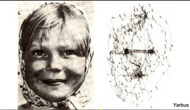 He showed that, rather than our eyes resting passively on a visual stimulus, our eyes actively examine the stimulus. He showed that eye movements consist mainly of fixations (focusing on specific point) and saccades (moving from one fixation to the next). Furthermore, the eye movements are focused on the most important parts of the visual stimuli, e.g. when seeing a face, there are most fixations at the eyes and the mouth, because they convey the most information.