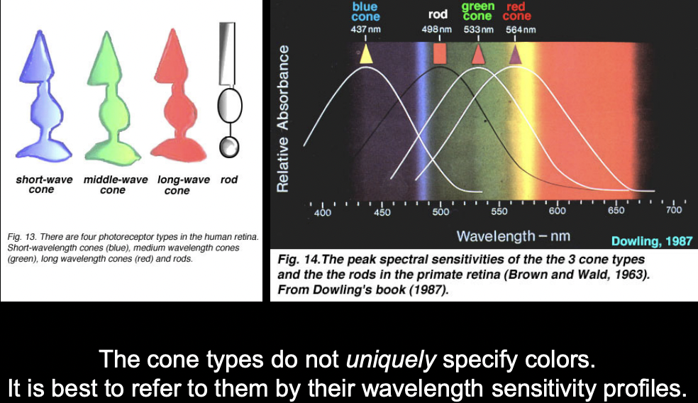 The cones have been assigned a colour, but it is more accurate to think of it in terms of a wavelength sensitivity based on a distribution on the spectral field. e.g the ‘red’-cone does not have peak sensitivity in the red area of the colour spectrum, but it is the only cone type which sensitivity distribution reaches into the red colour. The colour output is based on the relationship between these three cone types.