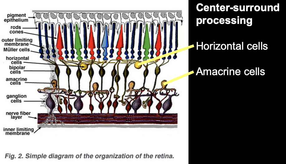 Cells that perform so-called horizontal processing of visual stimuli. Horizontal cells are located between the photorecptors and the bipolar cells, and Amacrine cells are located between the bipolar cells and the ganglion cells.