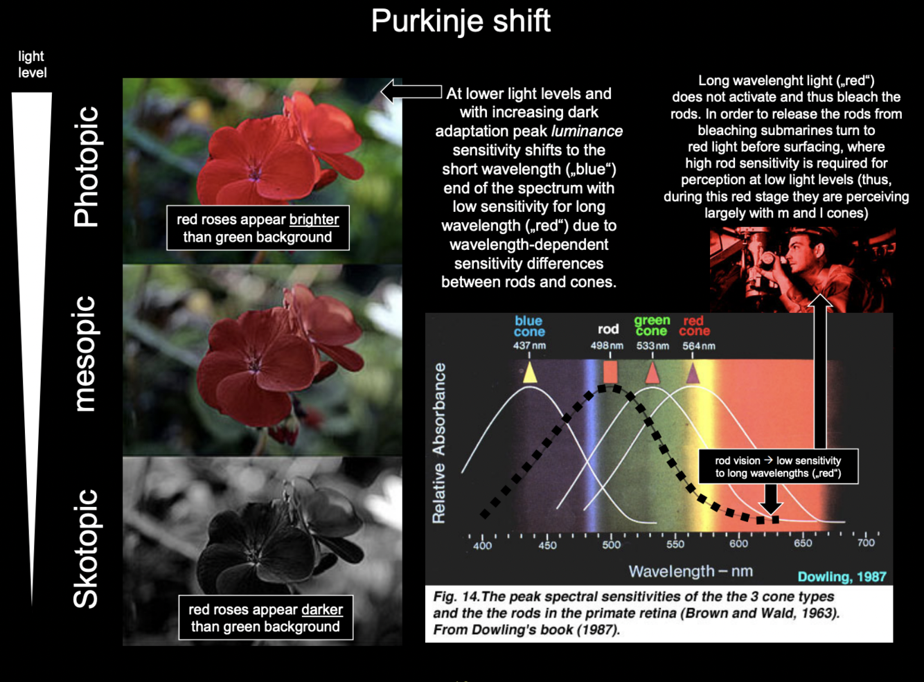 The Purkinje shift is a shift in perceived brightness of colours when going from light conditions to low-light conditions. Due to the difference in wavelength sensitivity between rods and cones, high wavelength colours (Red and Yellow) appear bright in photopic vision(Light), whereas low wavelength colours (blue and green) appear bright in skotopic vision (Low-light).