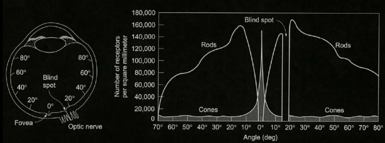 Where the optic nerve leaves the eye (15 degrees off the fovea), there is a blind spot, because no photoreceptors are present. What’s interesting is that even though nothing is perceived in this spot, it is filled in by what the brain deems most likely based on the surroundings.