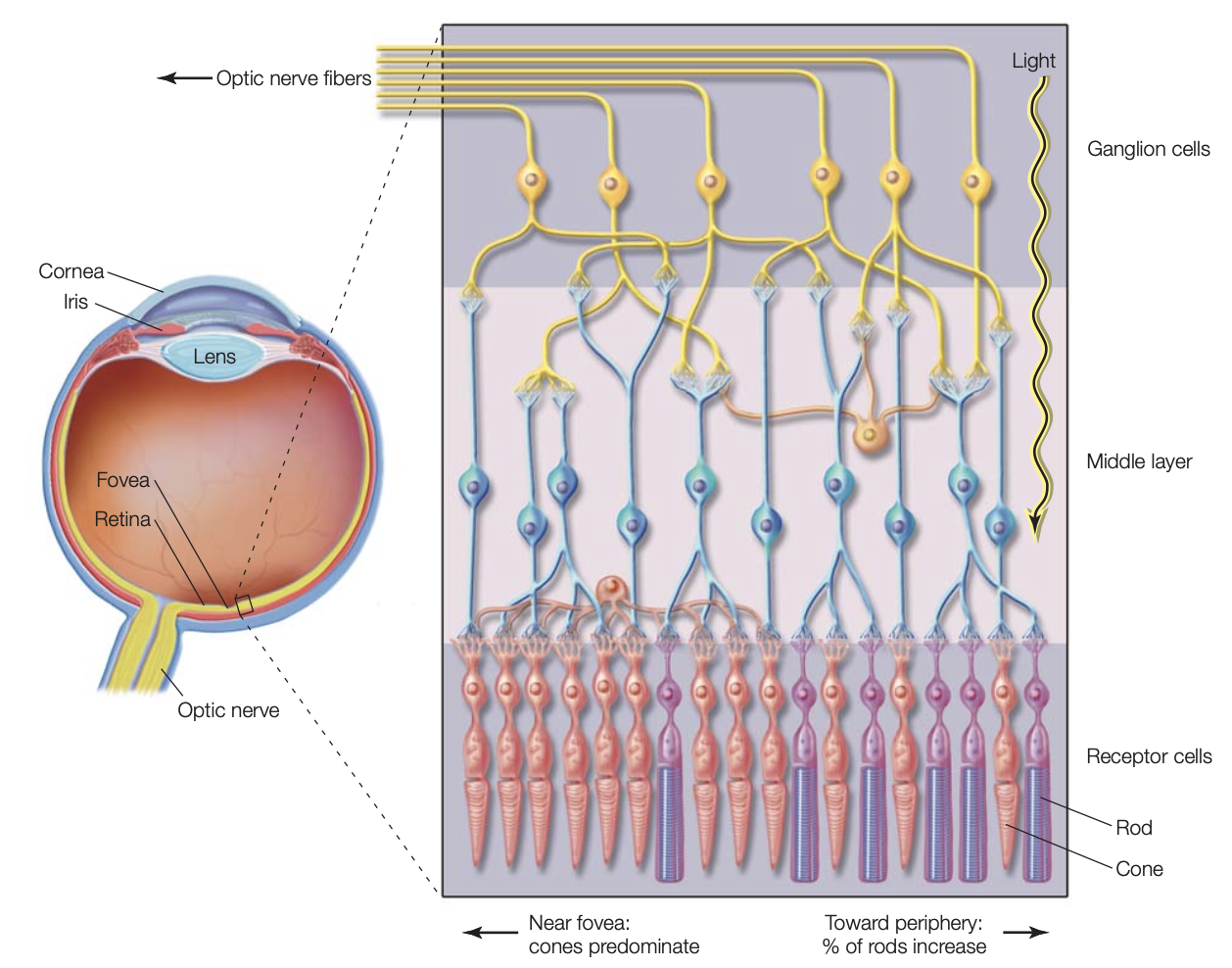 The fovea eye pit does not have any rods or other neurons, only millions of tightly packed cones. By grouping en masse, cones get optimal exposure to soak up light as it comes into the eye, allowing them to create the sharpest possible image.