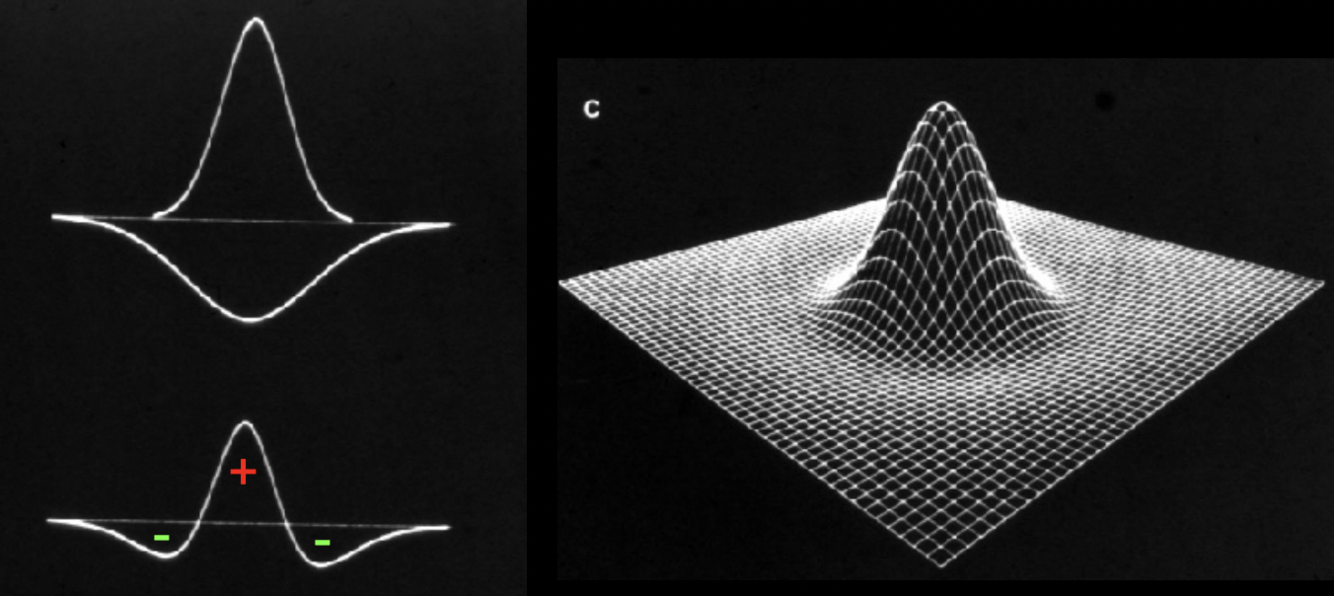 The Mexican hat filter is a 3d representation of the on-off activation in a single single ganglion cell. The filter has a high spike in the middle and is lower around the spike, mimicking the ganglion cell response pattern.