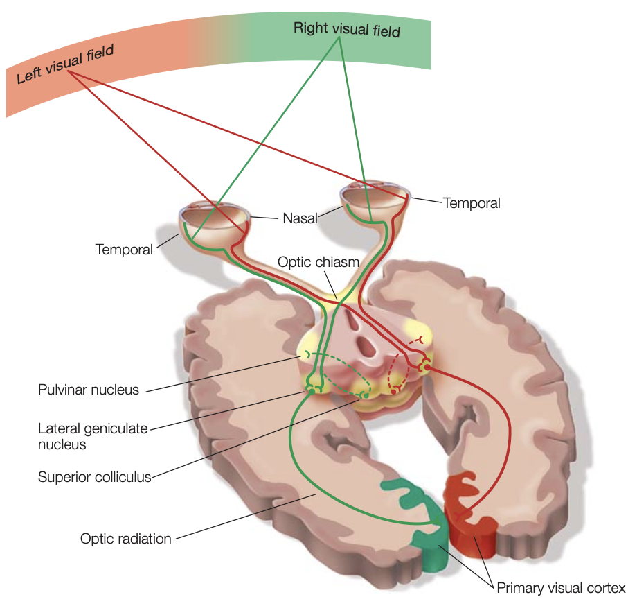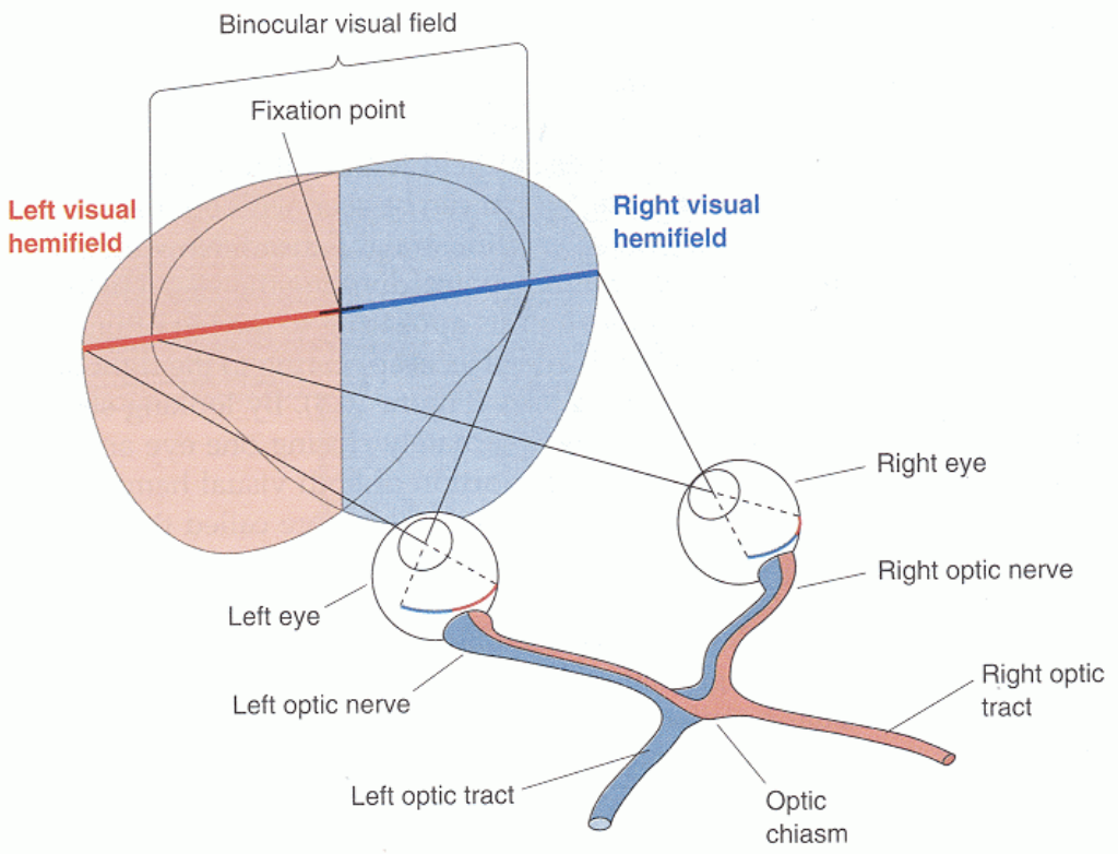 The left and right visual hemifields are the visual field to the left and right of our fixation point. Both eyes are involved in processing both hemifields, however the ipsilateral eye corresponds to a larger area. The optic nerve projects information from both hemifields until it reaches the optic chiasm, which separates the axons coming from the right and left hemifields, and directs them to the contralateral side, making up the right and left optic tract. The visual system functions via contralateral processing, meaning that the left hemifield is processed in the right part of the brain, and vice versa.