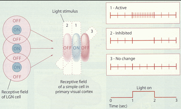 A bar of light at the orientation of an ON subfield that is moved or flashed within the subfield will simultaneously activate all of the presynaptic geniculate ON-center cells. The resulting barrage of synaptic excitation will depolarize the cortical cell and cause it to fire spikes. In contrast, a bar moved or flashed at right angles to the subfield will only activate a small subset of the underlying geniculate relay cells at one time. The resulting depolarization of the simple cell would be too small to reach threshold, leaving the simple cell inactive.