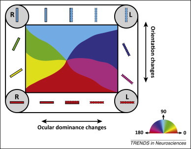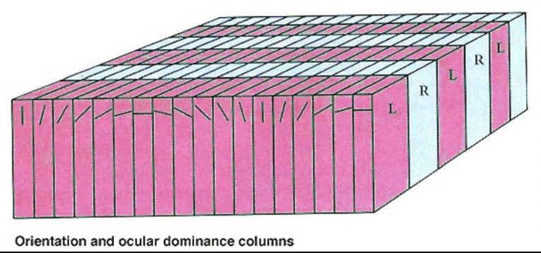 First, the cube is arranged in orientation columns containing neurons with similar orientation selectivity, so that in the vertical extent, there is no change of response properties, whereas along one tangential axis, there is a continuous change for preferred orientation. Second, in addition to columns of cells sensitive to different orientations, cells in V1 are also organized into alternating ocular dominance columns, which contain cells that are responsive only to input from the left or right eye. Third, cells responding to color are organized into regions called blobs