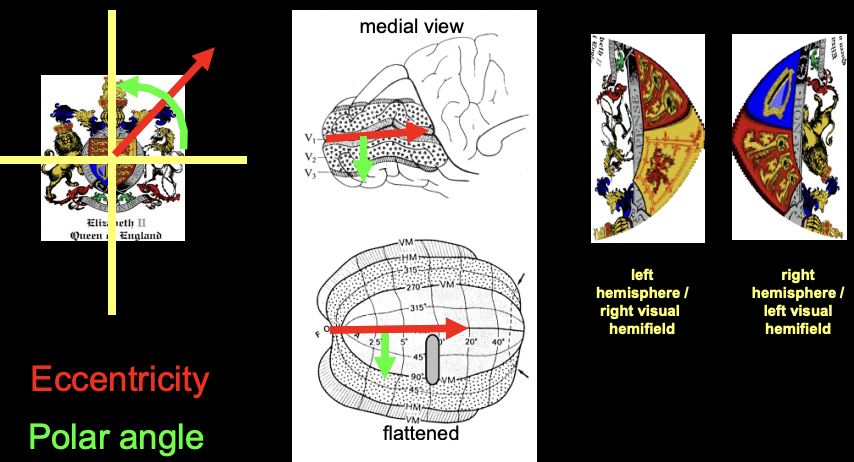 As a continuation of V1 (split into hemifield) V2 splits into two quarter field representations.