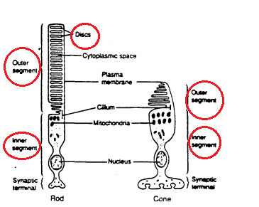 The outer segment consists of a stack of membranous discs, which contain the photopigment and the light transducing apparatus. The inner segment contains the cell nucleus and most of the biosynthetic machinery